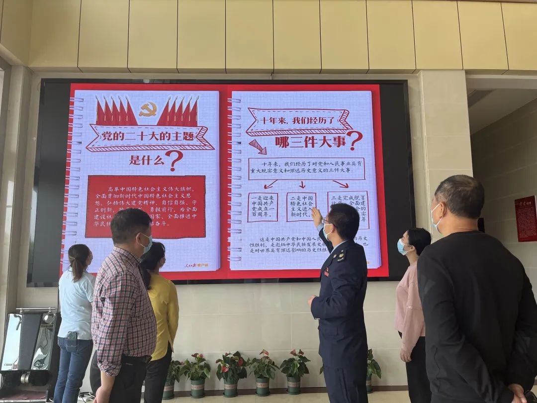 在四川,泸州市纳溪区税务局在办税大厅播放二十大报告图解,向纳税人宣传党的二十大精神。