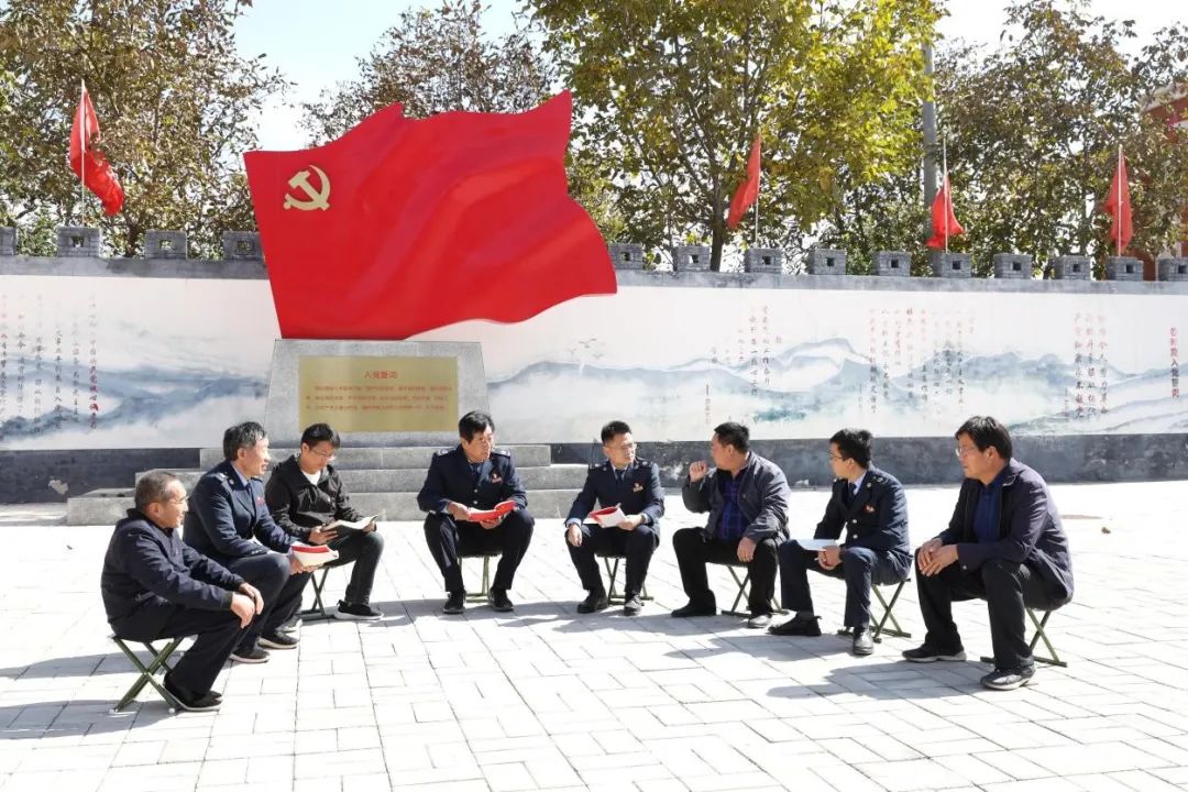 在陕西,咸阳市税务局驻东塬村工作队队员、村“两委”干部和村民党员代表在桃渠塬革命旧址学习党的二十大精神。