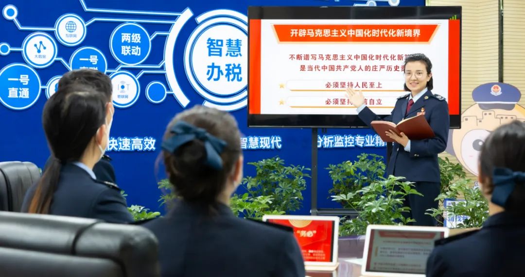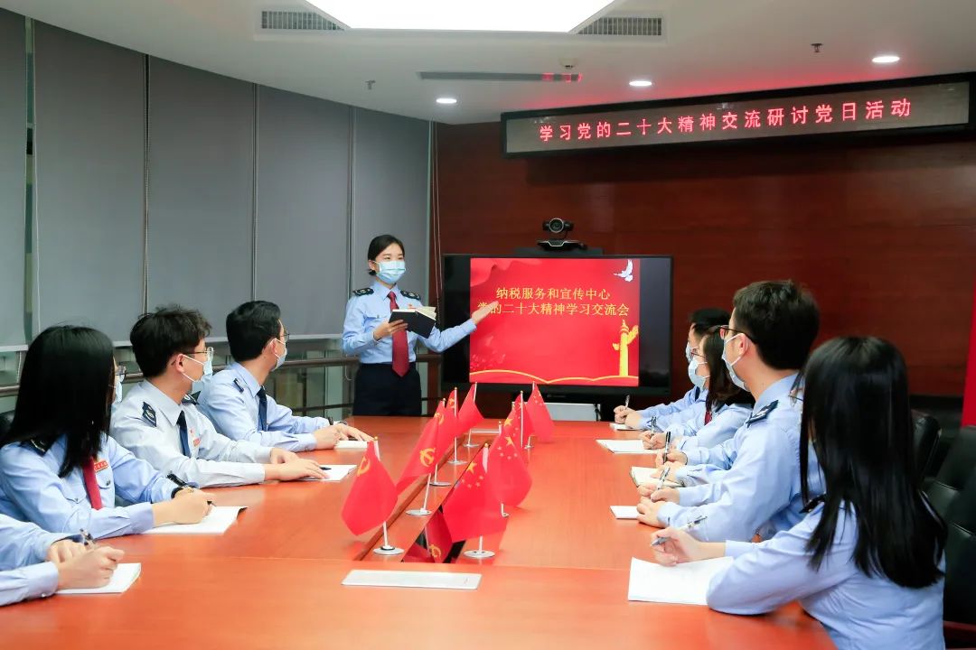 在深圳,深圳市税务局纳税服务和宣传中心举办主题党日活动,集中学习党的二十大精神。